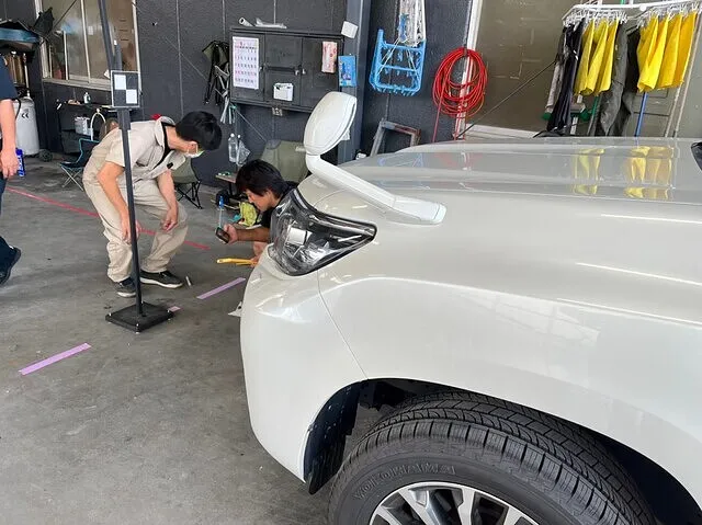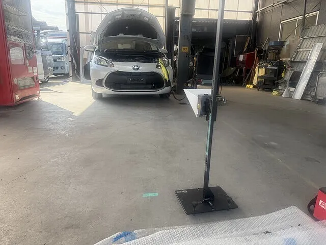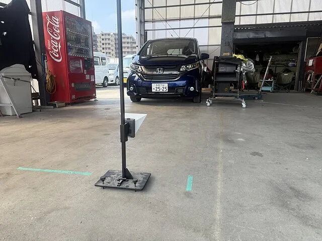 自動ブレーキや踏み間違い防止パーツなどが搭載されているお車は、車検時に「エーミング」という作業が必須。エーミングとは、センサーが正しく作動しているか?という検査です。他にもフロントガラスの交換や修理の時にも行っています。