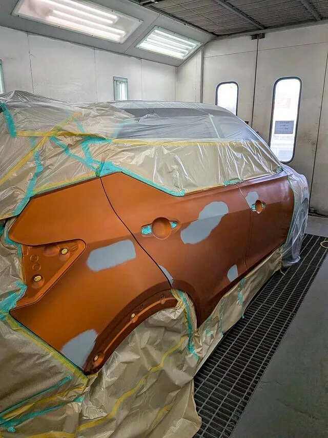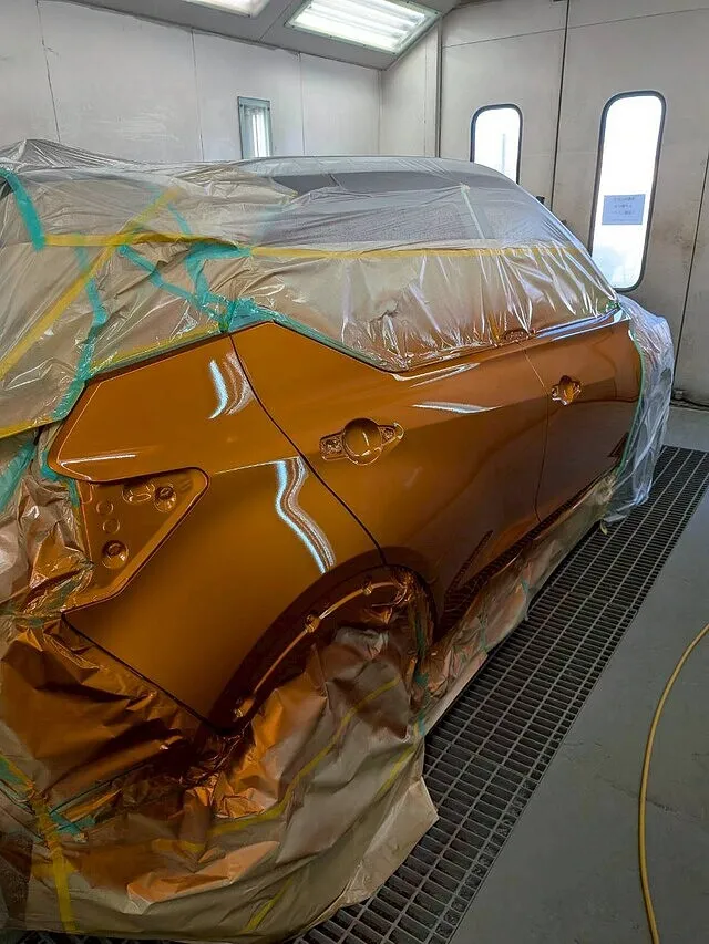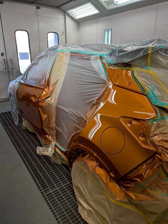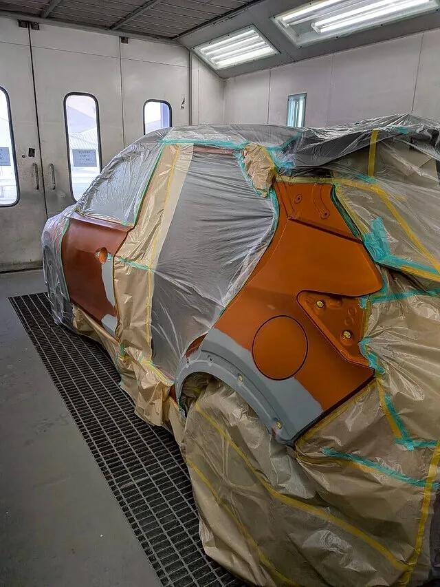 塗装ブースの中で、マスキングされた車体が静かに佇んでいます。