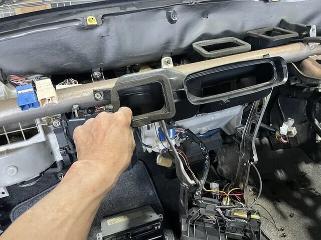 車のダッシュボード奥に手を伸ばし、配線やエアコンダクトを慎重に扱う場面。